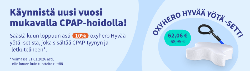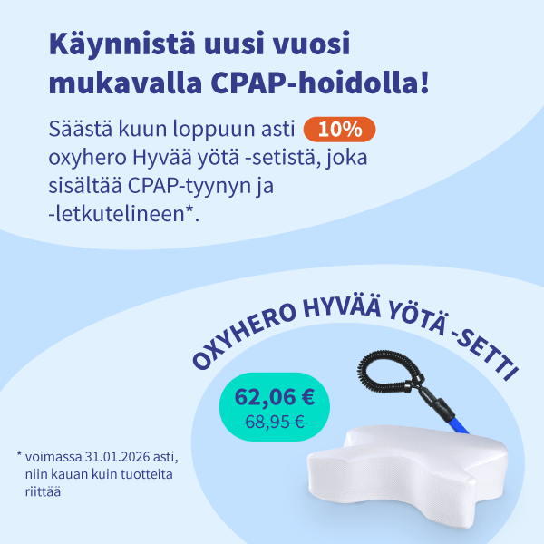 Varmista CPAP-tyynyä valitessasi, että sen korkeus on oikea. Tämä käy helposti: Mittaa tavallisen tyynyn korkeus, joka tuntuu käytössä hyvältä. CPAP-tyynyn korkeuden tulisi olla lähes vastaava. CPAP-tyynyn korkeustiedot löydät kunkin tuotteen kohdalta tuotetiedoista.
